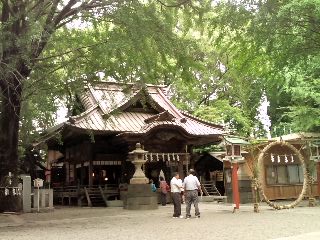 拝殿の前に設置された大きな輪が、「茅の輪」というもので、参列者は大祓詞をとなえた後、切麻を両肩にかけて祓い、和歌をうたいながら行進して、この輪を左→右→左、と8の字に3度くぐる。